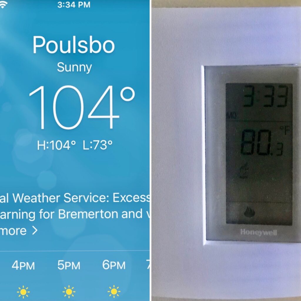 My house passed through the recent record-breaking heatwave in the PNW with flying colors, even though it has no air conditioning. It was consistently 20° cooler inside than outside, relying only on overhead fans, 14″ insulating walls, and a light colored roof. The temperature inside ranged from 76° to 79°, with the exception of a few hours when the temperature outside rose to 104° and the temperature inside rose to 80°. The breeze from the overhead fans and the cool concrete floor (which was set at 72° and therefore not generating heat) kept me comfortable.